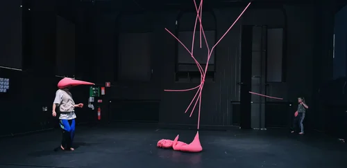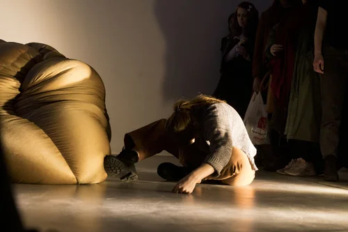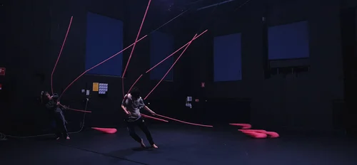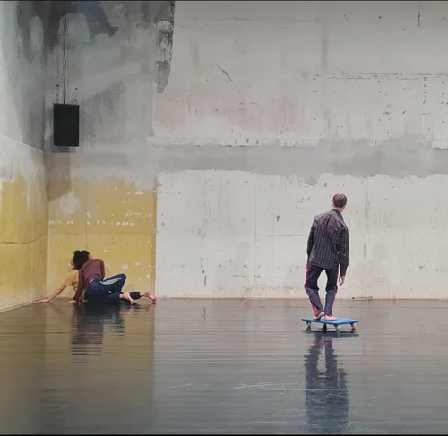 The work draws inspiration from group hypnosis, exploring both its fascinating and skeptical aspects. The piece reflects on the movements and dynamics observed in hypnotic states, while engaging with the choreographic potential inherent in such states of mind.